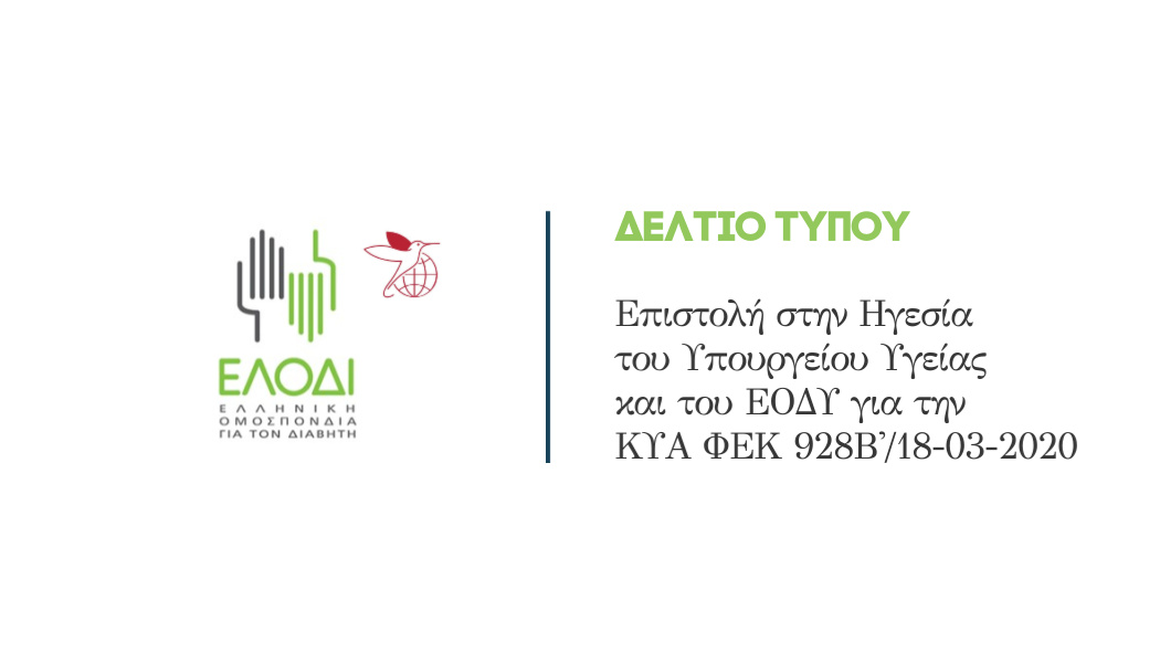 Η Ελληνική Ομοσπονδία για τον Διαβήτη (ΕΛ.Ο.ΔΙ.) απέστειλε στις 19 Μαρτίου 2020 επιστολή στον Υπουργό Υγείας κ. Κικίλια, στον Υφυπουργό Υγείας κ. Κοντοζαμάνη, στον Γενικό Γραμματέα Δημόσιας Υγείας κ. Πρεζεράκο, στον Πρόεδρο του Εθνικού Οργανισμού Δημόσιας Υγείας κ. Αρκουμανέα και στην Ειδική Επιτροπή Εμπειρογνωμόνων – Λοιμωξιολόγων του ΕΟΔΥ, ζητώντας την άμεση τροποποίηση της υπ΄ αρ. ΔΙΔΑΔ/Φ.64/315/οικ.8030 Κοινής Υπουργικής Απόφασης των Υπουργών Εσωτερικών και Υγείας (ΦΕΚ 928 Β’/18-03-2020), ως προς την ατυχή της πρόβλεψη για επέκταση του δικαιώματος χορήγησης ειδικής άδειας σε εργαζόμενους του Δημοσίου με «αρρύθμιστο διαβήτη». Με την παρούσα επιστολή επισημαίνεται η αστοχία στο κείμενο της απόφασης και ζητείται η τροποποίησή της ώστε να συμπεριληφθούν ανεξαιρέτως όλοι οι τύποι σακχαρώδη διαβήτη, ανεξάρτητα από την πρόοδο της πάθησης, την ύπαρξη ή μη επιπλοκών και το προφίλ της ρύθμισης.