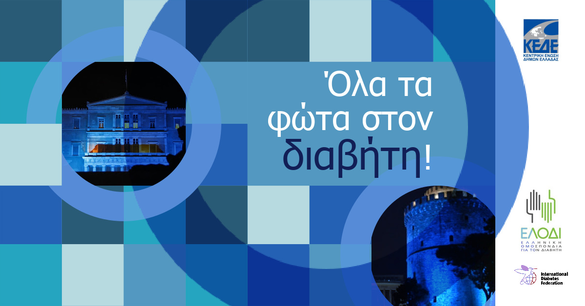 Η 14η Νοεμβρίου 2020 ντύνει την Ελλάδα στο μπλε χρώμα του διαβήτη! Η Ελληνική Ομοσπονδία για τον Διαβήτη (ΕΛΟΔΙ) και τα σωματεία – μέλη της, με την υποστήριξη της Κεντρικής Ένωσης Δήμων Ελλάδας (ΚΕΔΕ) και σε συνεργασία με περισσότερους από 15 Δήμους της χώρας, φωταγωγεί συμβολικά κτίρια, μνημεία και τοπόσημα το βράδυ της φετινής Παγκόσμιας Ημέρας Διαβήτη, σε μία προσπάθεια ευαισθητοποίησης του γενικού πληθυσμού και ενίσχυσης της ορατότητας της πάθησης με την όποια ζουν σήμερα περίπου 1 εκατομμύριο συνάνθρωποι μας στην Ελλάδα και 463 εκατομμύρια άτομα παγκοσμίως.