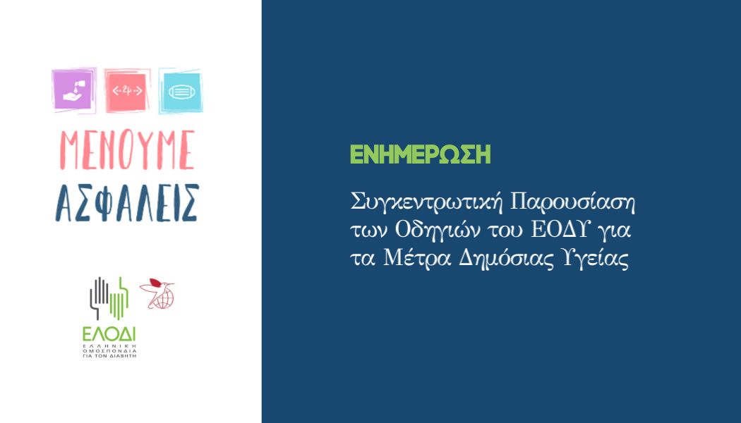 Με έναν συγκεντρωτικό πίνακα, ο Εθνικός Οργανισμός Δημόσιας Υγείας (ΕΟΔΥ) διευκρινίζει τα μέτρα δημόσιας υγείας που θα ισχύσουν κατά την περίοδο σταδιακής αποκλιμάκωσης των περιοριστικών μέτρων που εξήγγειλε η κυβέρνηση στα τέλη Απριλίου. Η Ελληνική Ομοσπονδία για τον Διαβήτη (ΕΛΟΔΙ) συγκέντρωσε και σας παρουσιάζει τις βασικές κατευθύνσεις του ΕΟΔΥ για την μετάβαση στην “επόμενη μέρα”. Όλες οι πληροφορίες είναι διαθέσιμες και στην ιστοσελίδα του ΕΟΔΥ.