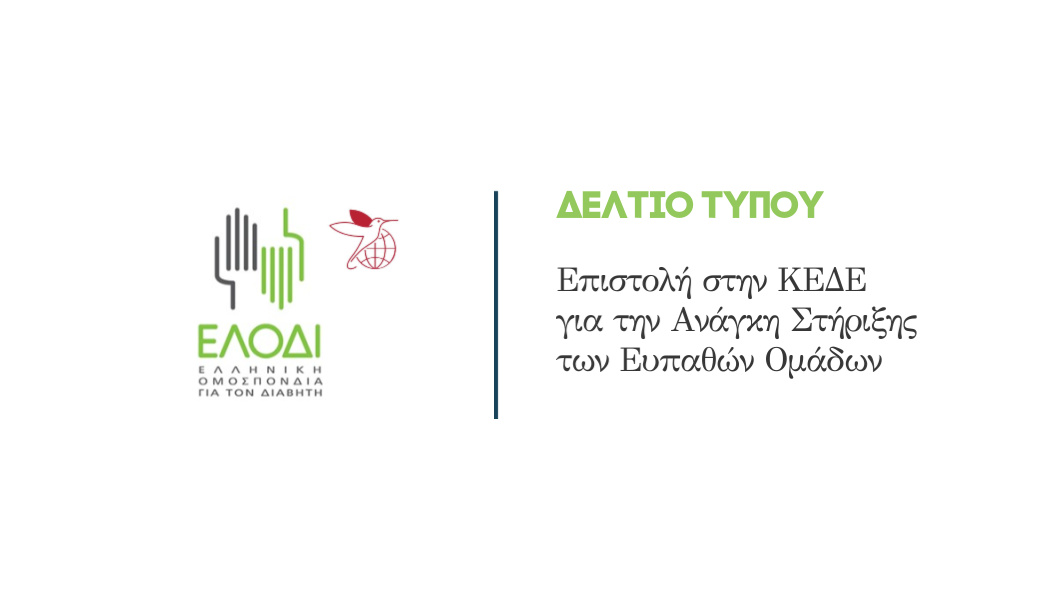 Επιστολή προς το Γραφείο του Πρωθυπουργού και τα Υπουργεία Υγείας, Εργασίας & Κοινωνικών Υποθέσεων και Εσωτερικών απέστειλε στις 03-02-2021 η Ελληνική Ομοσπονδία για τον Διαβήτη (ΕΛ.Ο.ΔΙ.) με προτάσεις που αφορούν στη λήψη μέτρων προστασίας των ανθρώπων που ζουν με σακχαρώδη διαβήτη στη χώρα μας, καθώς και όσων τους παρέχουν φροντίδα.