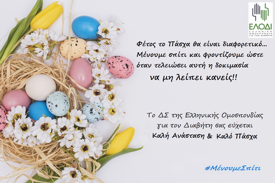 Το Διοικητικό Συμβούλιο της Ελληνικής Ομοσπονδίας για τον Διαβήτη (ΕΛ.Ο.ΔΙ.) σας εύχεται καλή Ανάσταση και καλό Πάσχα. #ΜένουμεΣπίτι για να βρεθούμε σύντομα με όλα τα αγαπημένα μας πρόσωπα!