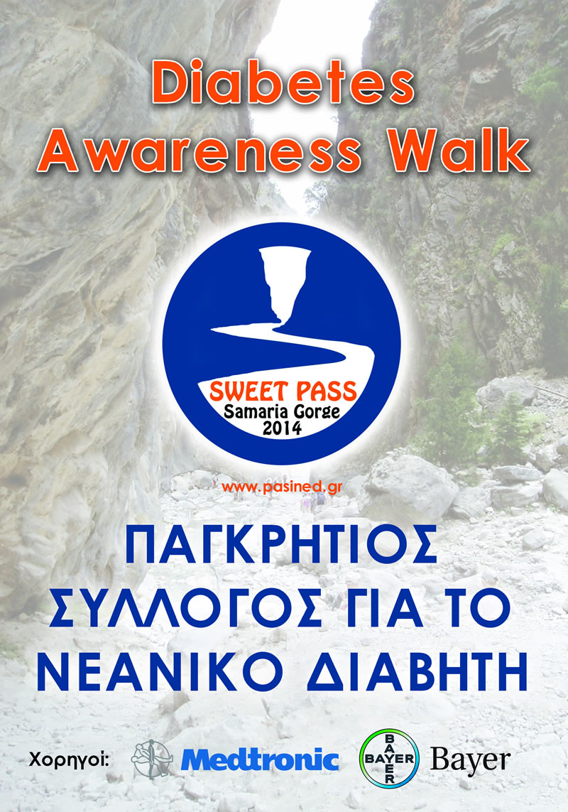 Το Σάββατο 30/08/2014, ο ΠΑΓΚΡΗΤΙΟΣ ΣΥΛΛΟΓΟΣ ΓΙΑ ΤΟ ΝΕΑΝΙΚΟ ΔΙΑΒΗΤΗ (ΠΑ.ΣΥ.ΝΕ.Δ.) – www.pasined.gr, σε συνεργασία με το Παιδοδιαβητολογικό Ιατρείο του ΠΑΓΝΗ και το Διαβητολογικό Κέντρο του Βενιζέλειου Νοσοκομείου, με τη συμμετοχή και γιατρών από την Αθήνα, διοργάνωσαν με μεγάλη επιτυχία μια πεζοπορία (SWEET PASS), στο φαράγγι της Σαμαριάς.